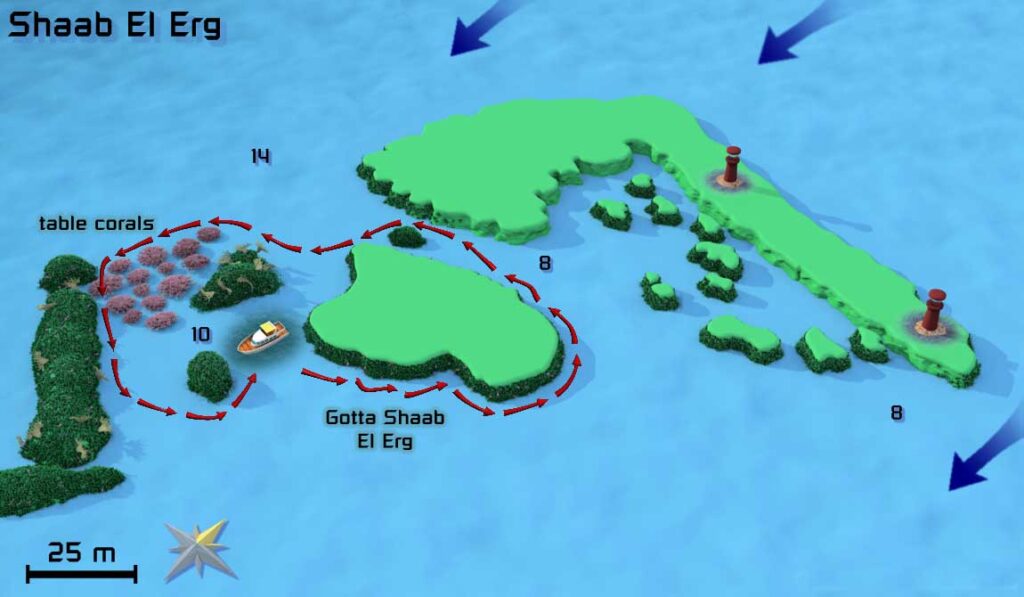In the vicinity of a large reef shaped like the letter “T,” surrounded by a sandy flat scattered with both larger and smaller coral blocks, several distinct diving sites await exploration. Among them are Shaab Iris, Erg Iris, Gotta Abu Nugar, and Shaab Abu Nugar.